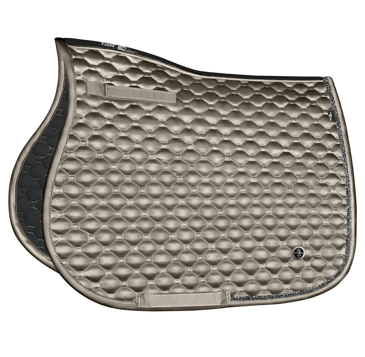 Czaprak posiada profilowany, anatomiczny kształt, który idealnie dopasowuje się do grzbietu konia, minimalizując ryzyko obtarć i zapewniając stabilne ułożenie pod siodłem. Jego oryginalne pikowanie oraz biżuteryjna taśma z kryształkami nadają mu wyjątkowej elegancji.