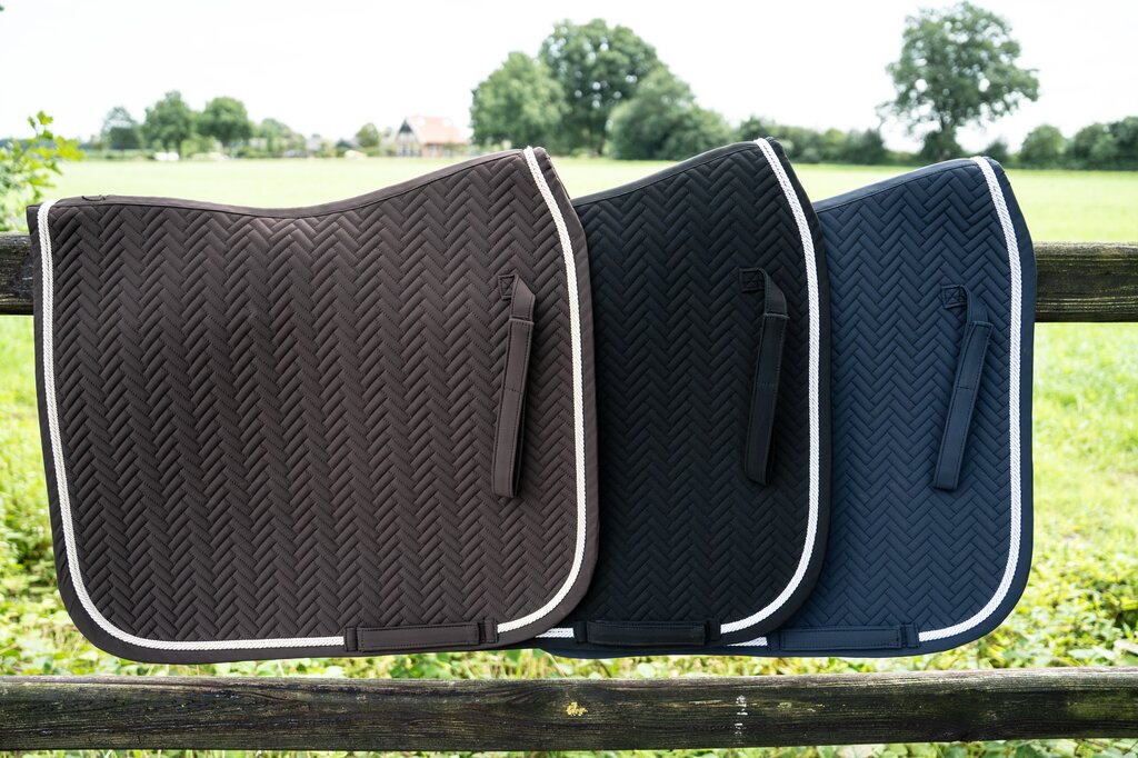 Wypełnienie z pianki i waty skutecznie tłumi wstrząsy, chroniąc grzbiet konia przed punktowym naciskiem. Czaprak posiada paski mocujące na rzep, dzięki którym pozostaje na swoim miejscu nawet podczas bardziej dynamicznej jazdy. Wykończenie ozdobnym sznureczkiem nadaje elegancki akcent i sprawia, że czaprak świetnie prezentuje się w komplecie z resztą wyposażenia.