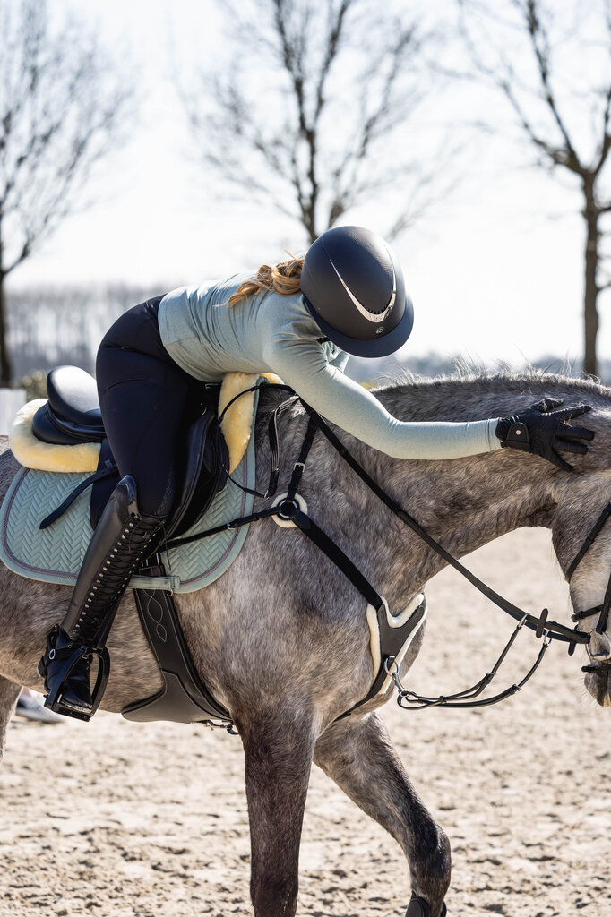 Wypełnienie z pianki i waty skutecznie tłumi wstrząsy, chroniąc grzbiet konia przed punktowym naciskiem. Czaprak posiada paski mocujące na rzep, dzięki którym pozostaje na swoim miejscu nawet podczas bardziej dynamicznej jazdy. Wykończenie ozdobnym sznureczkiem nadaje elegancki akcent i sprawia, że czaprak świetnie prezentuje się w komplecie z resztą wyposażenia.