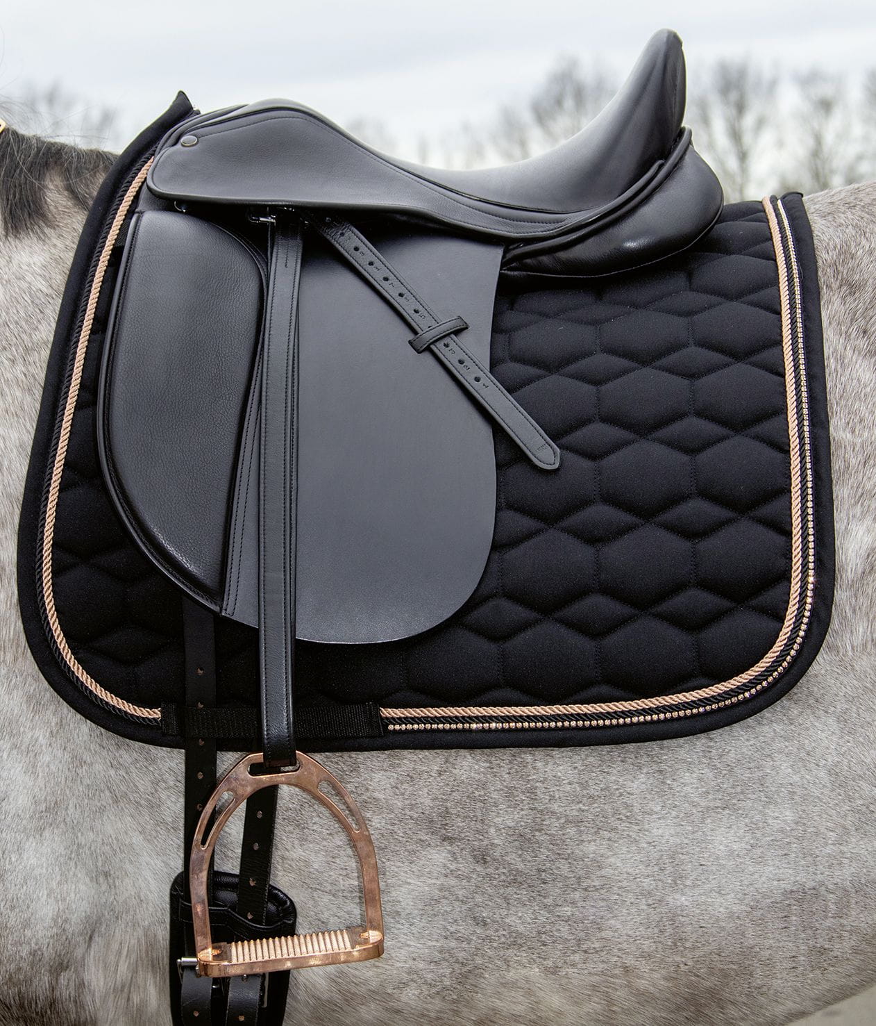 - Ozdobne wykończenie: Modne pikowanie, dwa dekoracyjne sznurki oraz elegancka lamówka z błyszczących kryształków nadają czaprakowi luksusowego charakteru.