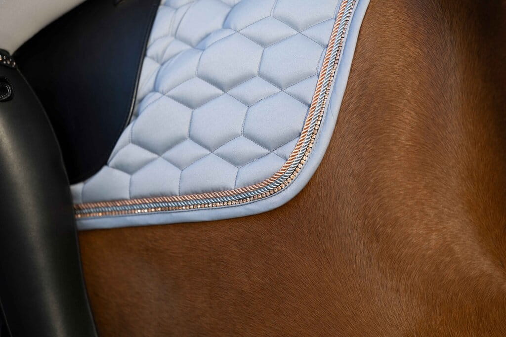 - Ozdobne wykończenie: Modne pikowanie, dwa dekoracyjne sznurki oraz elegancka lamówka z błyszczących kryształków nadają czaprakowi luksusowego charakteru.