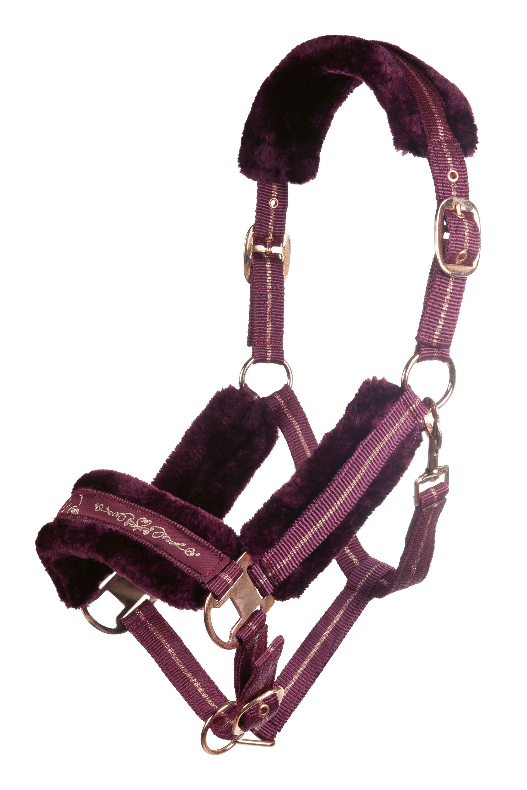 - Eleganckie okucia i haft w kolorze rosegold – modny kolor rosegold nadaje kantarowi stylowy i luksusowy wygląd, podkreślając prestiż konia zarówno w stajni, jak i na padoku.