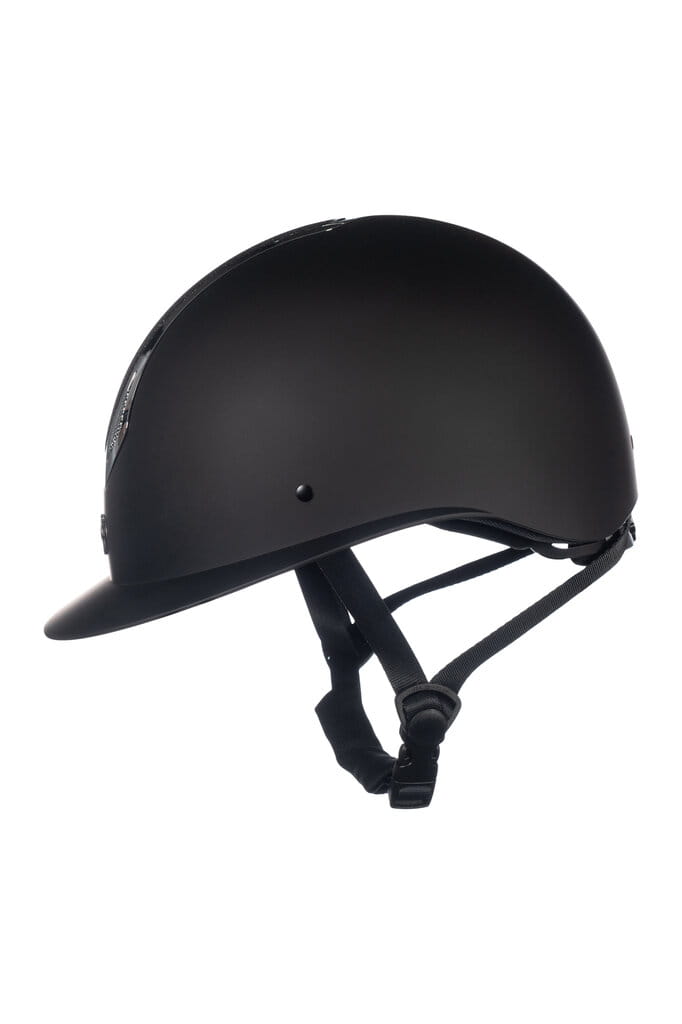 - Ciekawy design - matowy kask jeździecki z brokatem i błyszczącym metalowym elementem ozdobnym.