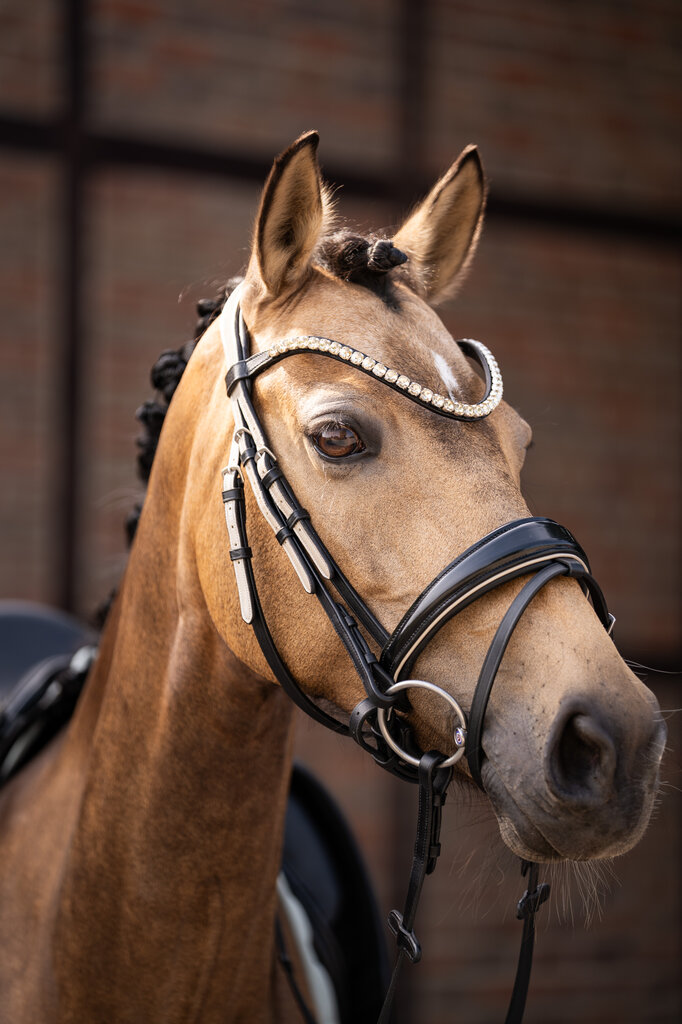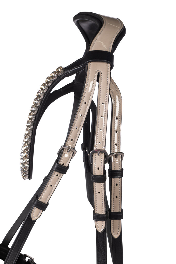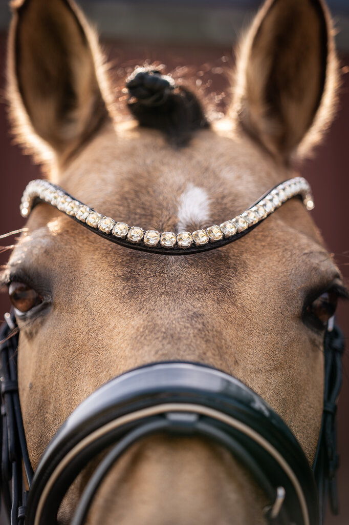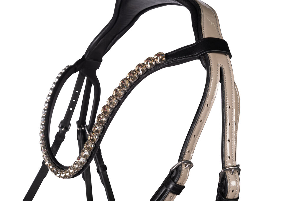 Efektowny naczółek z kryształkami nadaje ogłowiu elegancki charakter, a stylowe detale i metalowe elementy podkreślają jego wyjątkowy wygląd.