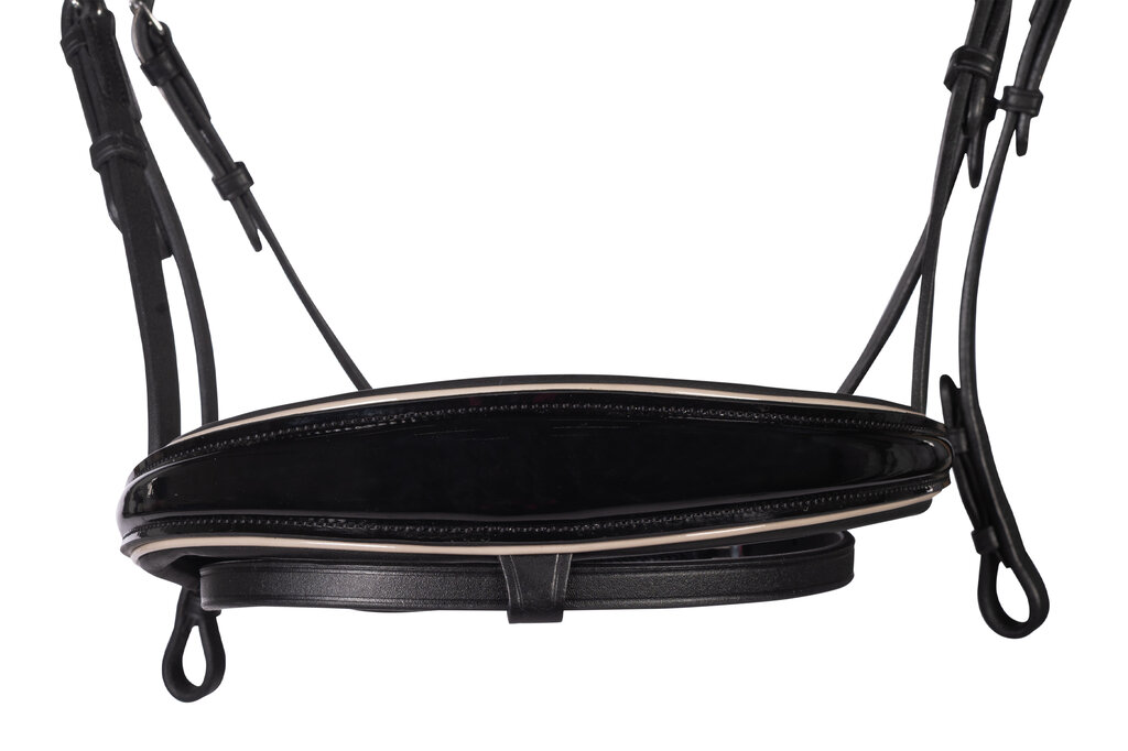 Model wyposażony jest w nachrapnik szwedzki, który umożliwia stabilne ułożenie ogłowia. Miękko podszyta potylica zwiększa komfort, ograniczając nacisk w wrażliwych miejscach.