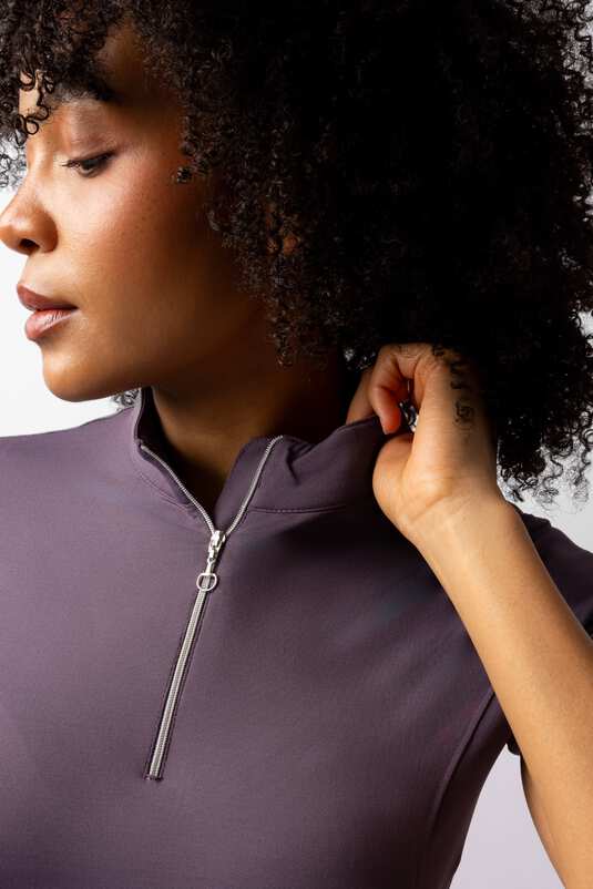 - Półdługi zamek błyskawiczny: Koszulka jeździecka ze stójką zapinaną na zamek umożliwia regulację temperatury podczas treningu.