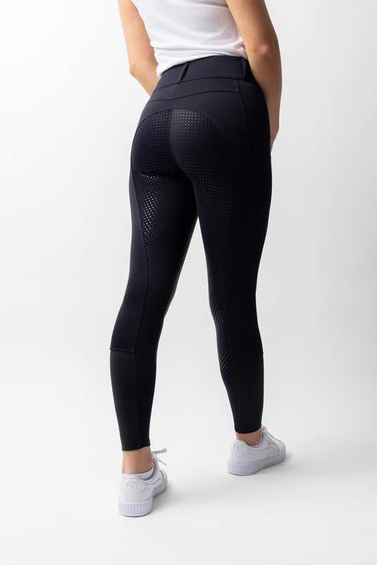 - Elastyczne zakończenia nogawek – lepsze dopasowanie do obuwia jeździeckiego.