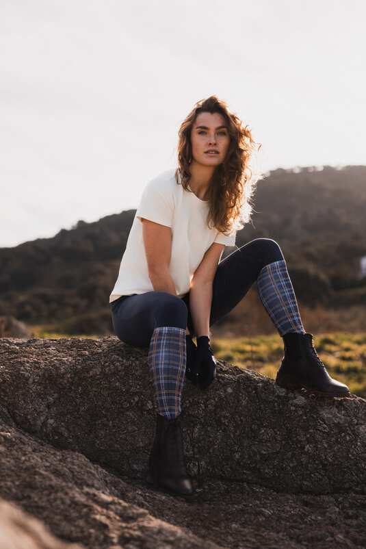 - Modny nadruk w kratę: Podkolanówki jeździeckie w kratę to nowoczesny wygląd, który wyróżnia się na tle klasycznych modeli.