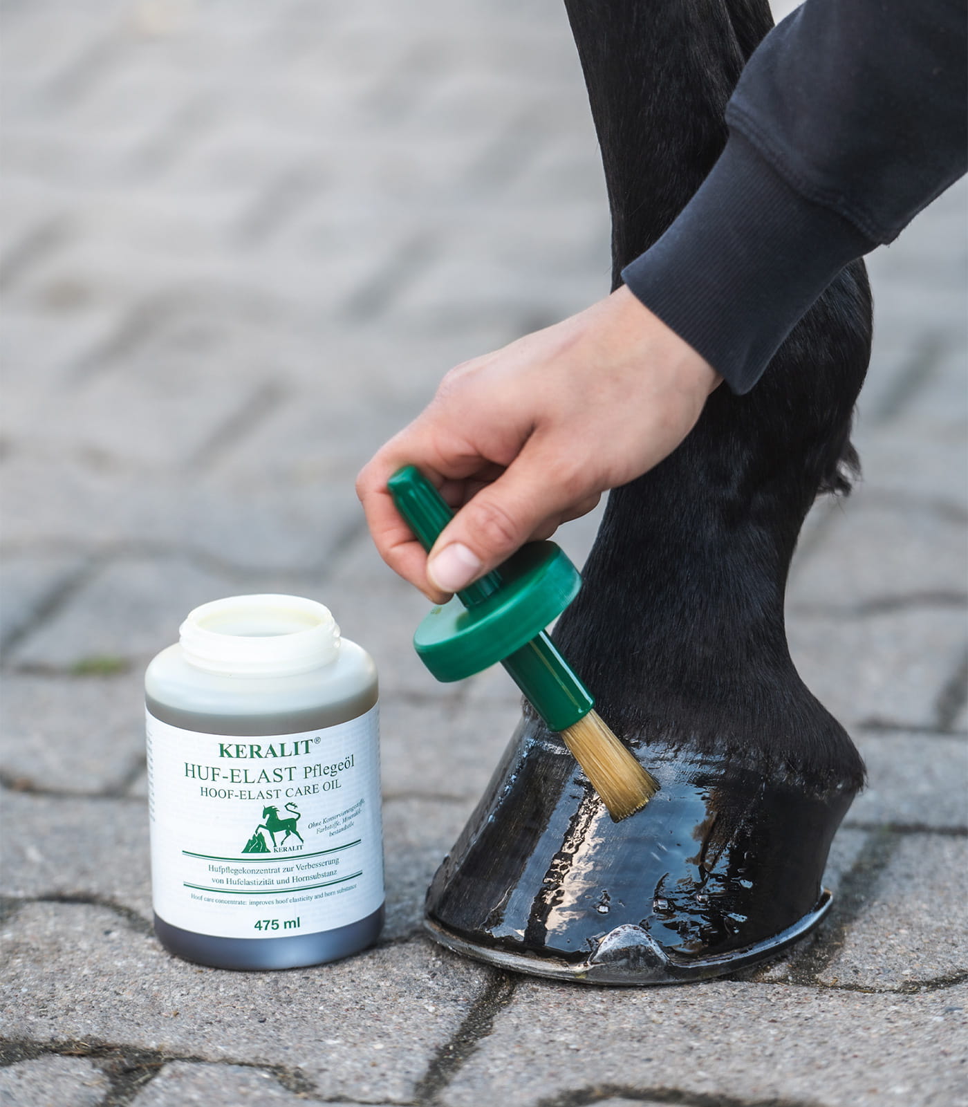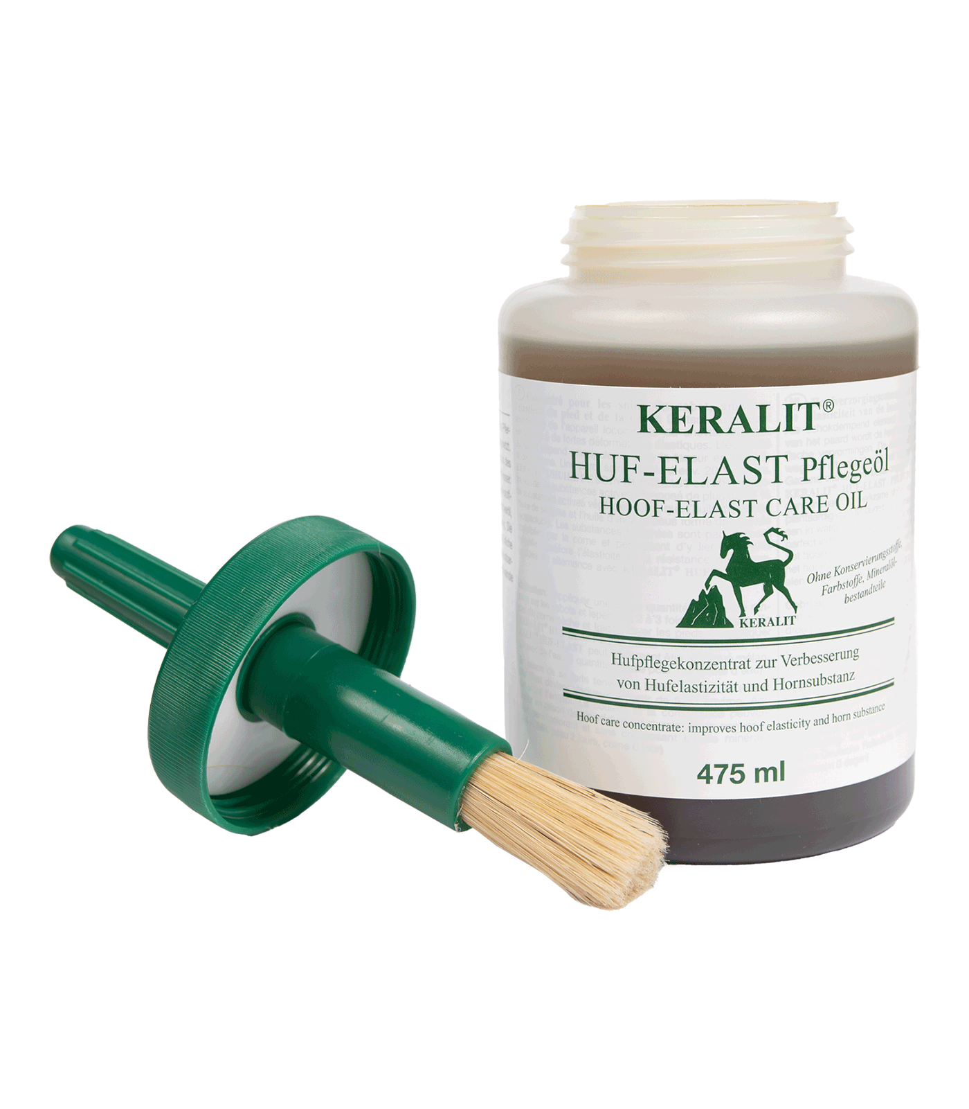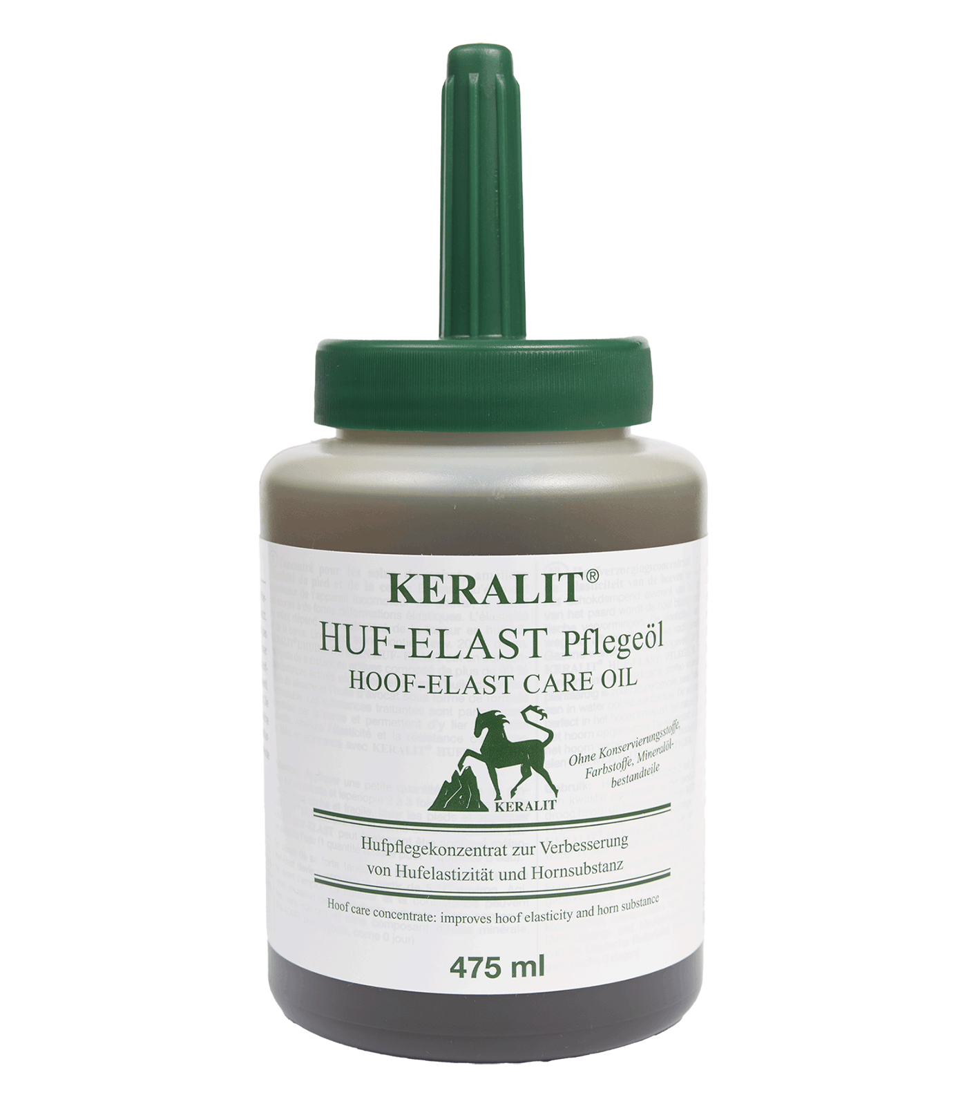 KERALIT Hoof-Elast Care Oil zawiera aktywne roślinne składniki , takie jak olejek laurowy, sezamowy, awokado i jojoba, w postaci rozpuszczalnej w wodzie i wiążącej wilgoć.