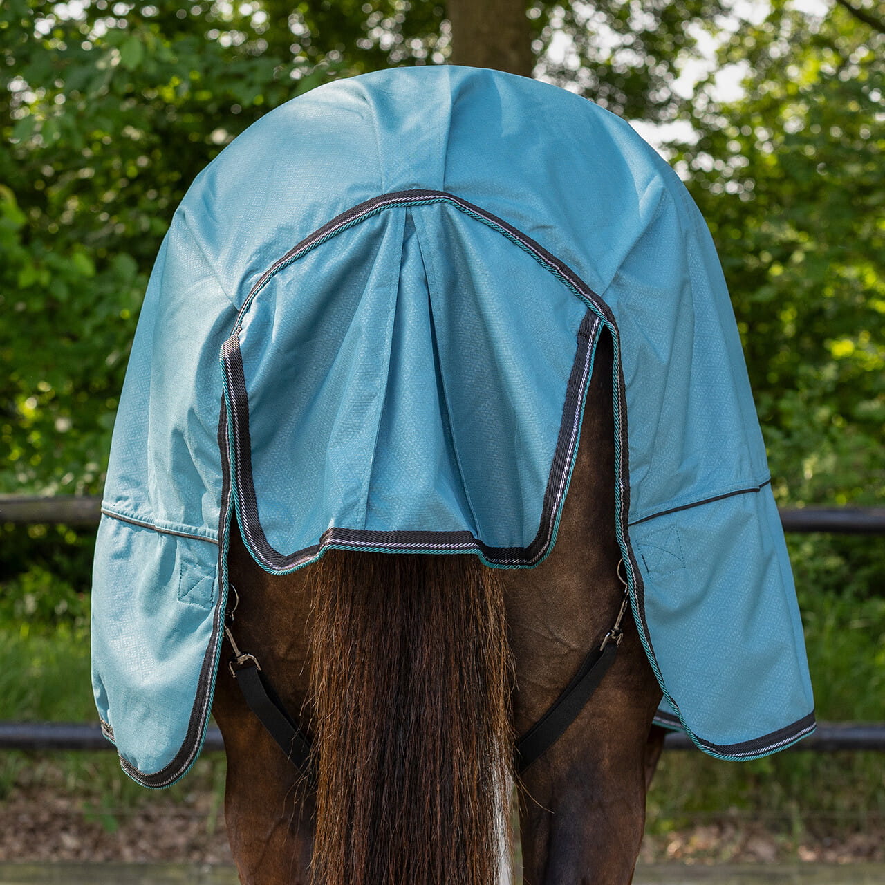 Komfort ruchu zwiększają wysokie rozcięcia na łopatkach, a miękka polarowa wkładka na kłębie chroni wrażliwe miejsca. Derka posiada elastyczne pasy krzyżowe, regulowane pasy na tylne nogi, sznurek ogonowy oraz dużą klapę na ogon, która zapewnia dodatkową osłonę. D-ringi pozwalają na przypięcie osobnego kaptura, a czarne metalowe wykończenia podkreślają solidność i elegancki wygląd.