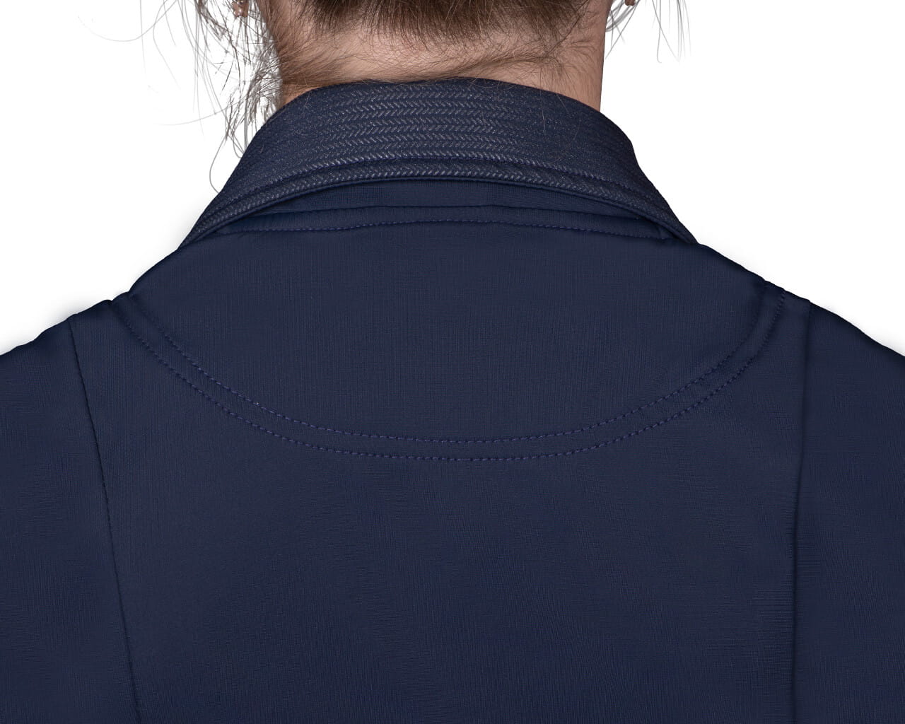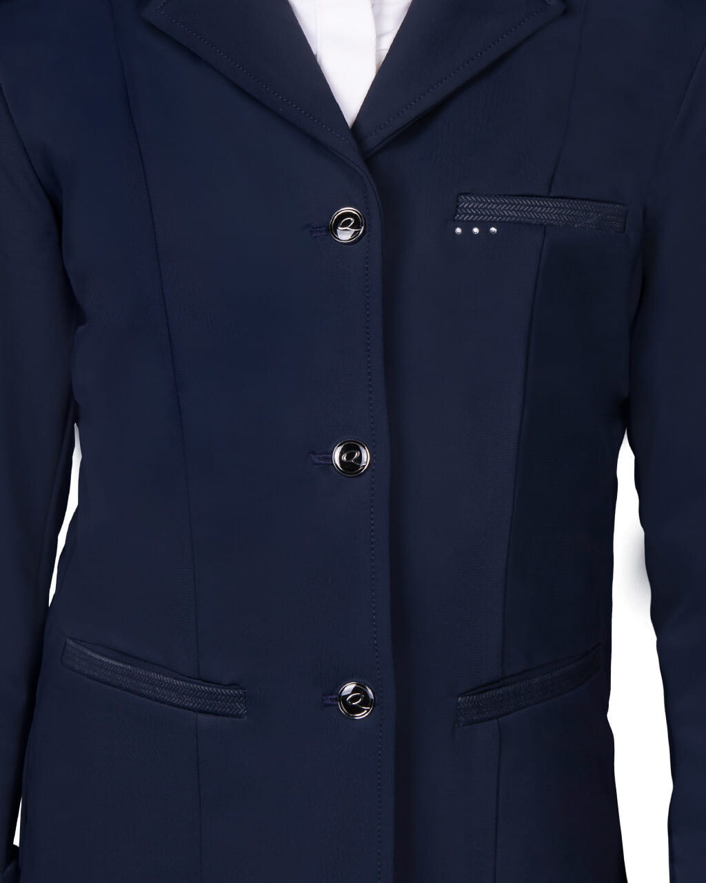 Frak wyróżnia się luksusowym rozcięciem z tyłu, które dodaje klasy i lekkości. Z przodu znajduje się elegancka przypinka z logo QHP, a na prawej piersi umieszczono trzy ozdobne diamenty, które nadają całości nowoczesnego, ale subtelnego blasku.