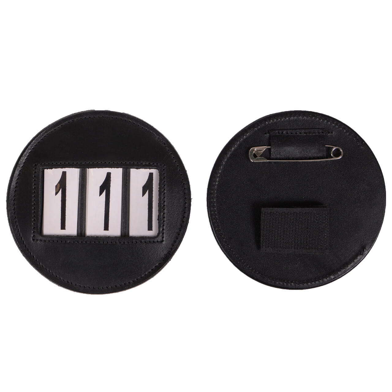 - Okrągły numer startowy wykonany ze skóry – elegancki i trwały.