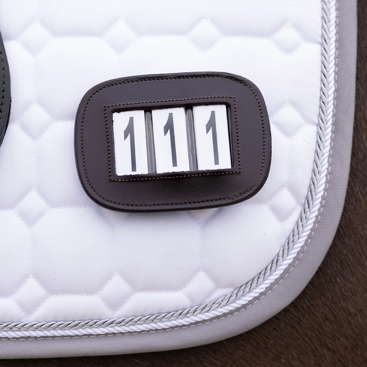 Numer startowy QHP Modeste Square w kolorze brown – elegancki skórzany numer startowy na zawody jeździeckie