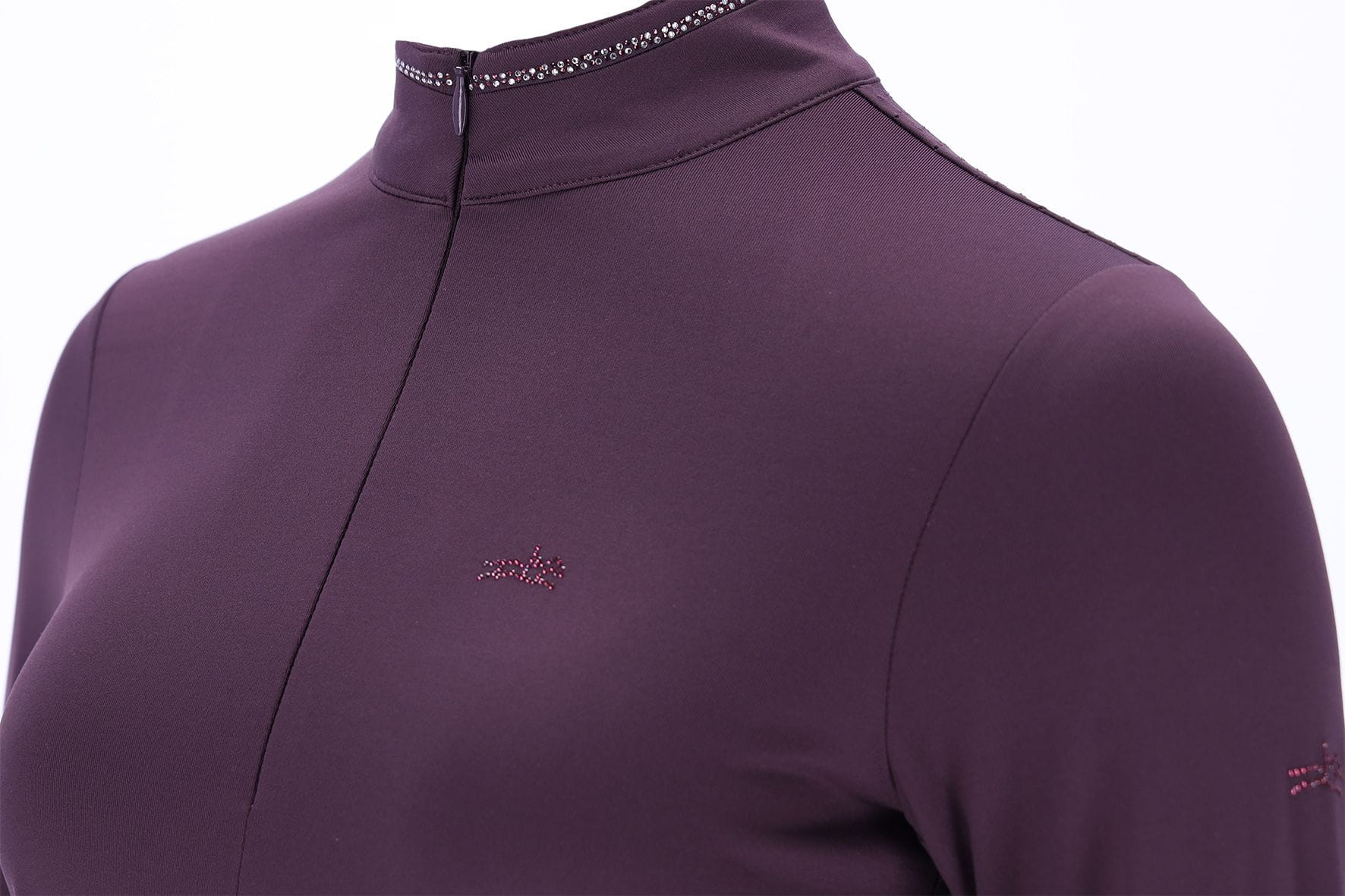- Błyszczące kryształki - koszulka jeździecka z kryształkami na kołnierzyku, kryształkowym logo na piersi, plecach i ramieniu.