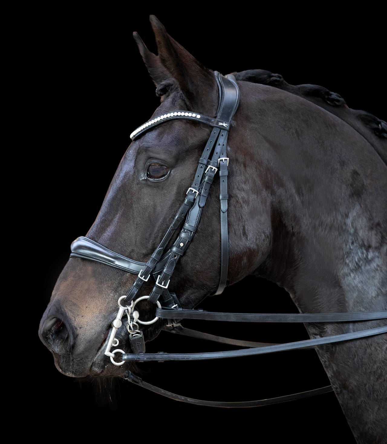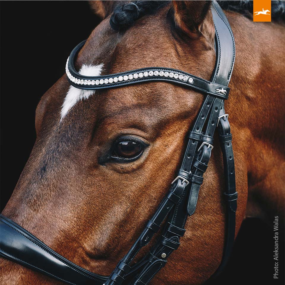 Elegancki naczółek z kryształkami w lekko opadającym kształcie dodaje całości wyjątkowego charakteru i podkreśla prestiżowy design ogłowia.