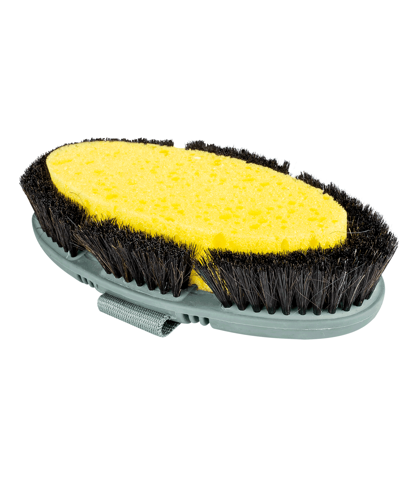 - Szczotka z włosia końskiego i syntetycznego z chłonną gąbką: Skuteczne usuwanie zabrudzeń przy jednoczesnym zachowaniu delikatności dla skóry i sierści konia.
